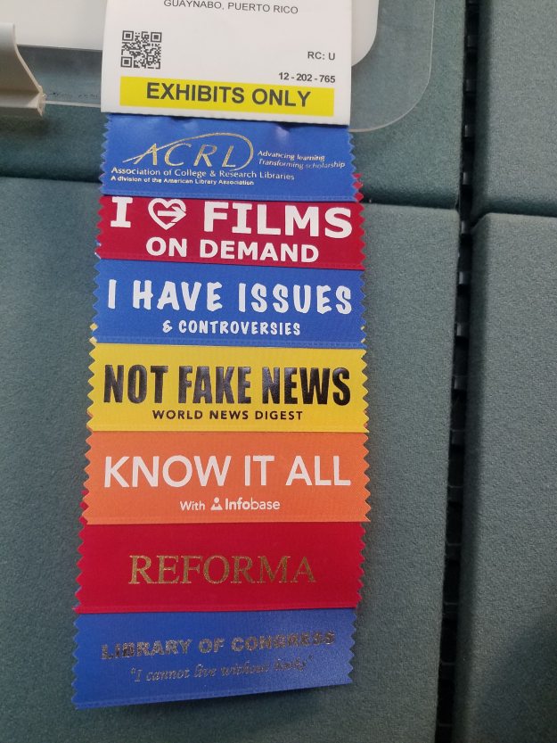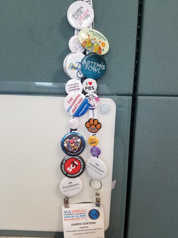 Otro aspecto curioso fueron los alfileres o broches que también otorgan los exhibidores. De la misma manera que sucedió con las cintas adhesivas, mi credencial terminó llena de alfileres y broches de todo tipo colocados artísticamente en la cinta para colgar la credencia. Termine con una pieza única que atestigua la gran experiencia de mi primera visita a los exhibidores de la convención anual de ALA.